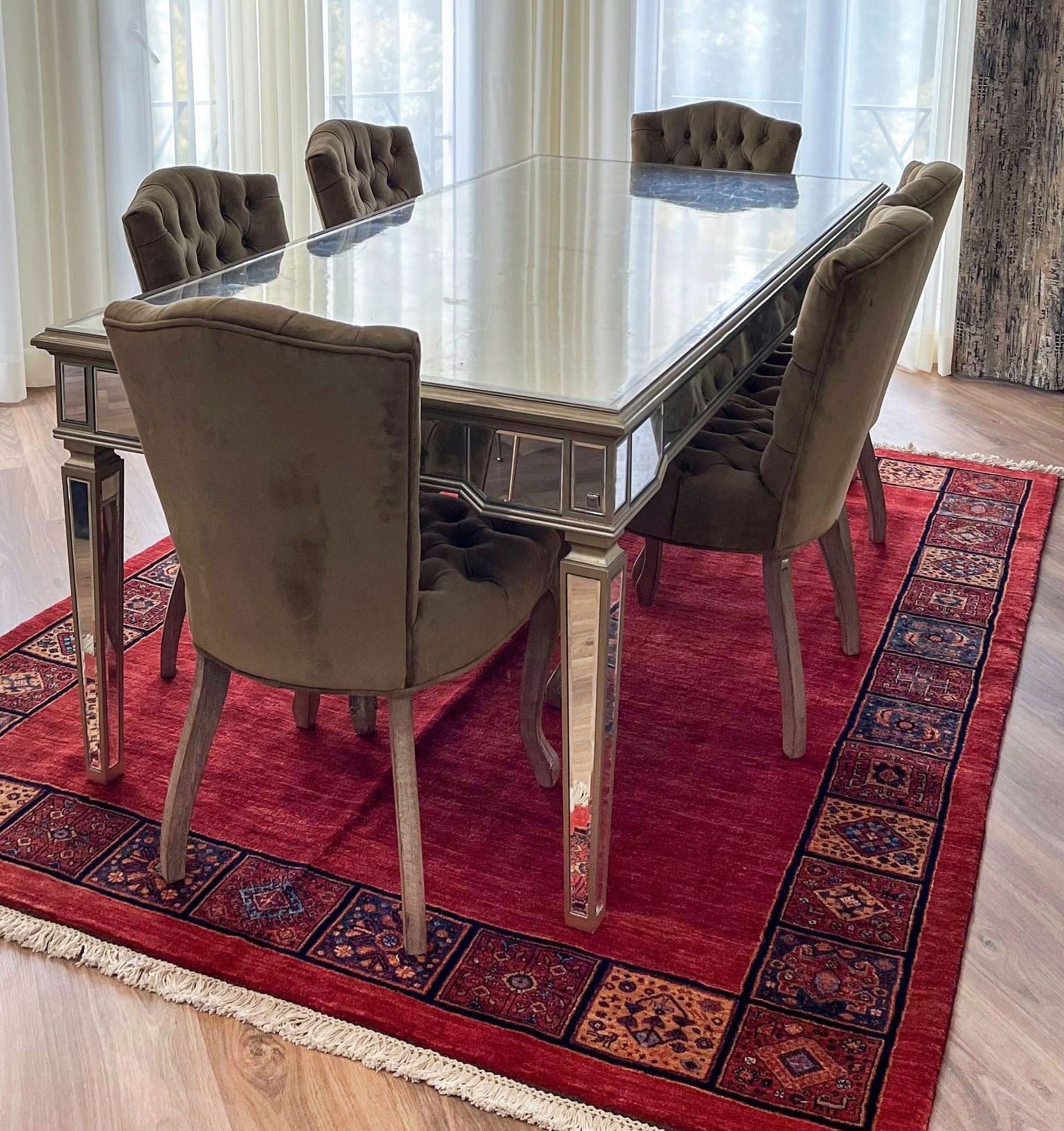 یکی از اولین و مهمترین مواردی که باید در انتخاب فرش برای میز غذاخوری مد نظر قرار گیرد، اندازه و ابعاد فرش است. تصمیم گیری درباره ابعاد فرش میز ناهارخوری به دو عامل بستگی دارد. ۱) ابعاد میز غذاخوری ۲) ابعاد فضای غذاخوری