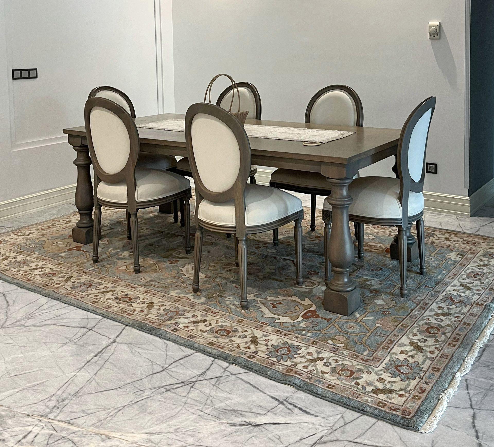 هنگام انتخاب فرش برای میز غذاخوری، ملاحظات کاربردی نقشی کلیدی دارند، زیرا این فضا به دلیل استفاده مکرر، مستعد سایش، لکه شدن و دیگر آسیبهاست. یکی از اصلیترین ملاحظات، دوام فرش است. فرشهایی که از مواد اولیه باکیفیت و مقاوم مانند پشم یا ترکیب پشم و ابریشم بافته شدهاند، برای این فضا مناسبتر هستند. پشم به دلیل مقاومت بالا در برابر سایش و لکهها، گزینهای ایدهآل است که میتواند در برابر استفاده روزانه و تردد زیاد مقاومت کند. همچنین، فرشهایی با بافت محکم و فشرده، کمتر دچار فرسودگی و تغییر شکل میشوند و طول عمر بالاتری دارند.